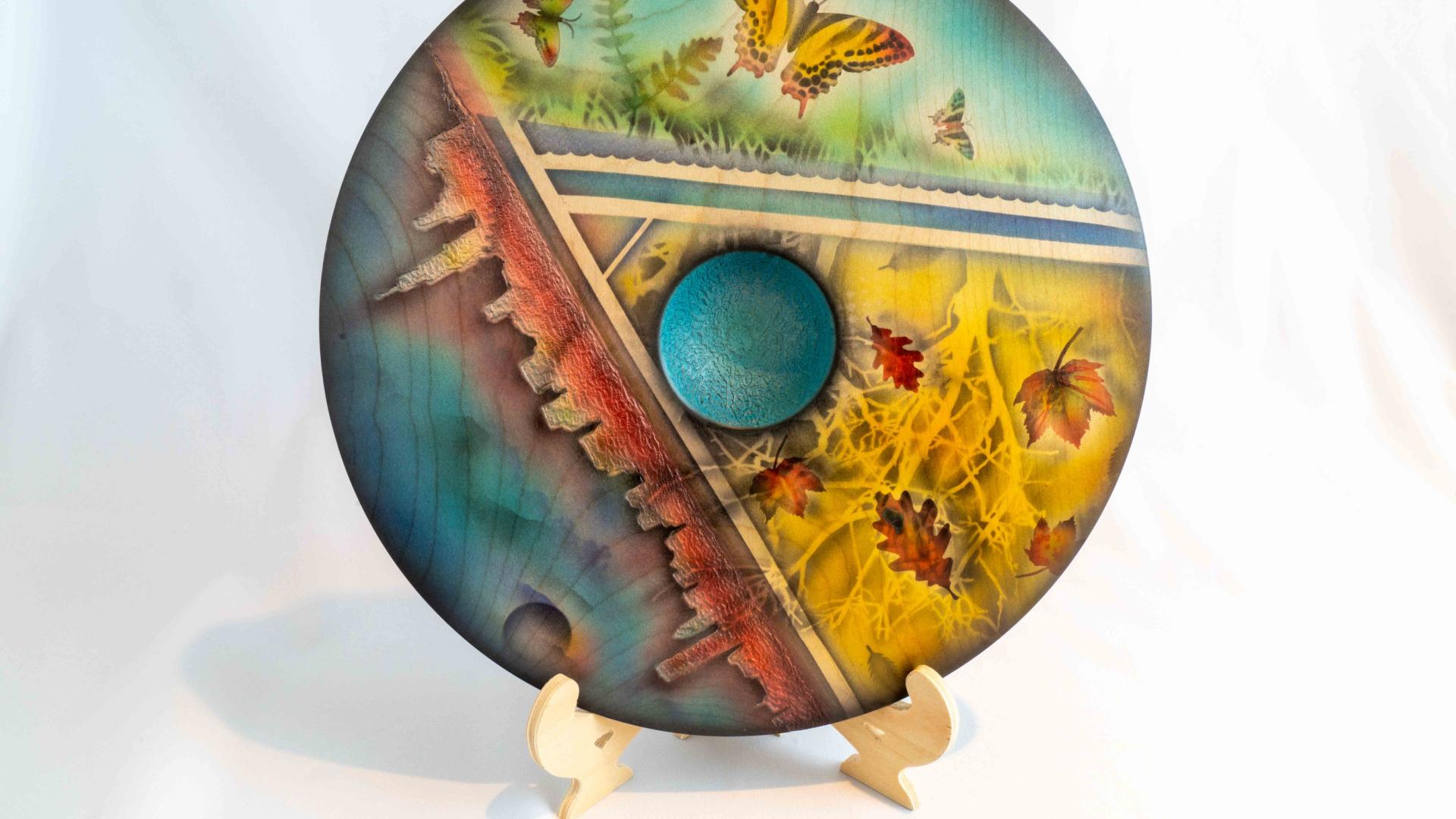 - Dreiing av fat, stort skjold med dekor som kan ligne på metall