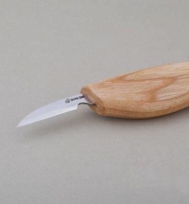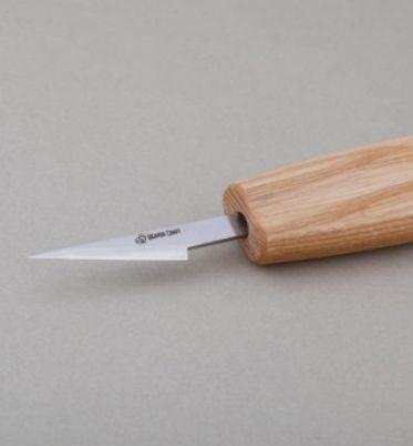 En perfekt kniv for detaljer. Bladet er skråstilt og tynt. Denne gjør det lett å komme til på trange områder! Kniven er håndlaget med knivblad i høykvalitets karbonstål. Håndtaket er laget i ask og behandlet med linolje. Passer til både venstrehendte og høyrehendte.