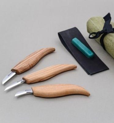 Flott sett med tre aktuelle kniver for karveskurd skjæring. Her følger det med 1 stk kraftig kniv, 1 stk kniv med tynt blad og en kniv med skrått blad. Inkludert i settet er også lærstropp og brynepasta, alt pakket i et praktisk futteral. Stålet i knivene er i høykarbonstål, ask håndtak behandlet med linolje.