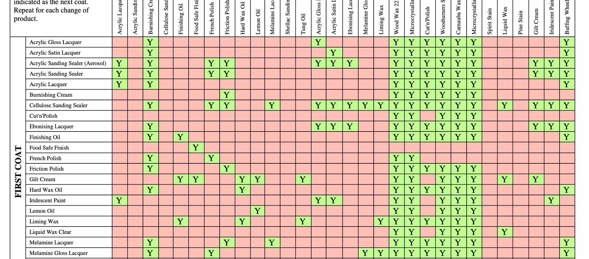 Chestnut har laget en flott oversikt over hvilke produkter som kan brukes sammen. Venstre kolonne angir første behandling og topp kolonne viser hvilke produkter som kan brukes sammen med det første laget som behandling nr 2.