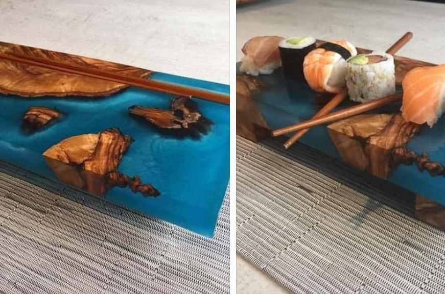Knud Lunde vil vise andre typer av overflatebehandling, f.eks Chsetnut produkter, Han har med seg ulike eksempler på gjenstander som viser ulike resultater på forskjellige treslag.