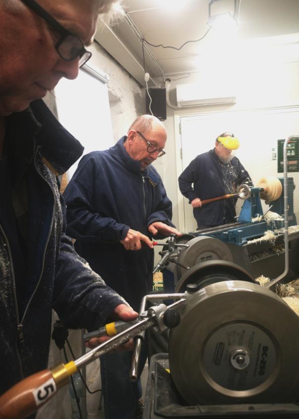 Sliping av dreiejern foregår med 2 stk Tormek T8 våtslipere, med tilhørende diamantskiver og jigger. Samt på Record benkesliper, med Oneway slipejigg.