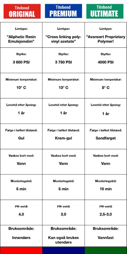 Det kan være utfordrende å vite forskjellen på de forskjellige limene man kan velge i. Her går vi igjennom forskjellen på våre mest solgte limtyper; Titebond, Titebond II og Titebond III.