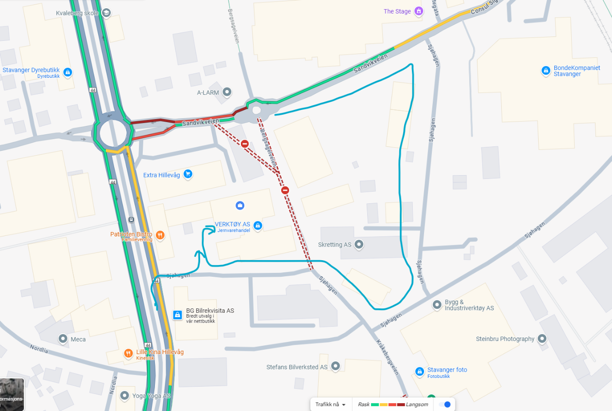 Innkjørsel via Bersagelveien er stengt for godt og du må nå kjøre ned Sandvikveien til Flintegata (står Sjøhagen på kart, men er skiltet med Flintegata) og følge veien videre til Sjøhagen 2, se blå strek. Alternativt fra Mariero, gjennom tunnel og første vei til høyre (før Patrioten Bistro), deretter til venstre inn i gården.