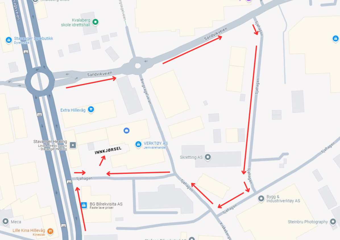 Kommer du fra Stavanger/Kilden på RV44 Hillevågsveien svinger du til venstre i rundkjøringen ved Sandvik veien. Dette er veien som går mot Felleskjøpet/Bondebutikken. Vanligvis kunne du svingt til høyre etter Extra butikken men her blir det nå stengt.