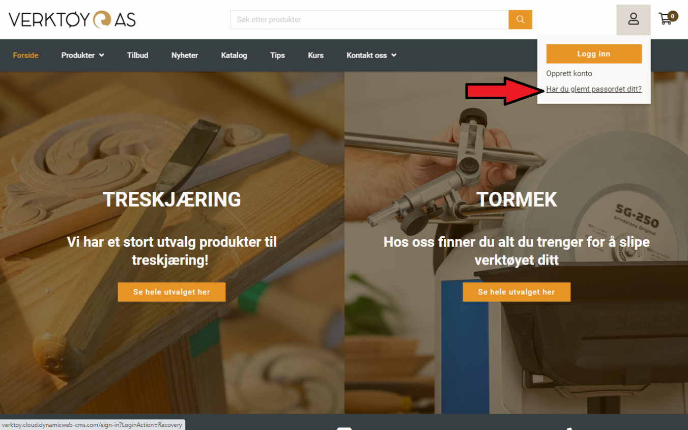 Dersom du har bruker i vår gamle nettbutikk må du få tilsendt et nytt passord. Klikk på "Har du glemt passordet ditt?" øverst til høyre som vist på bildet.