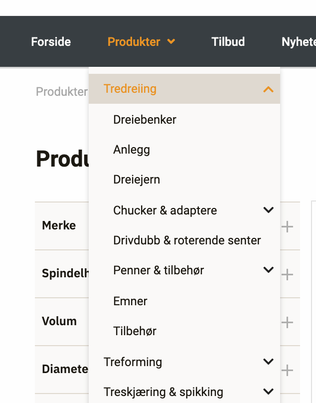 Når du trykker på produkter kan du få opp en mer detaljert meny ved å trykke på de små pilene ved siden av hovedkategorien. Da vil det vise flere underkategorier.